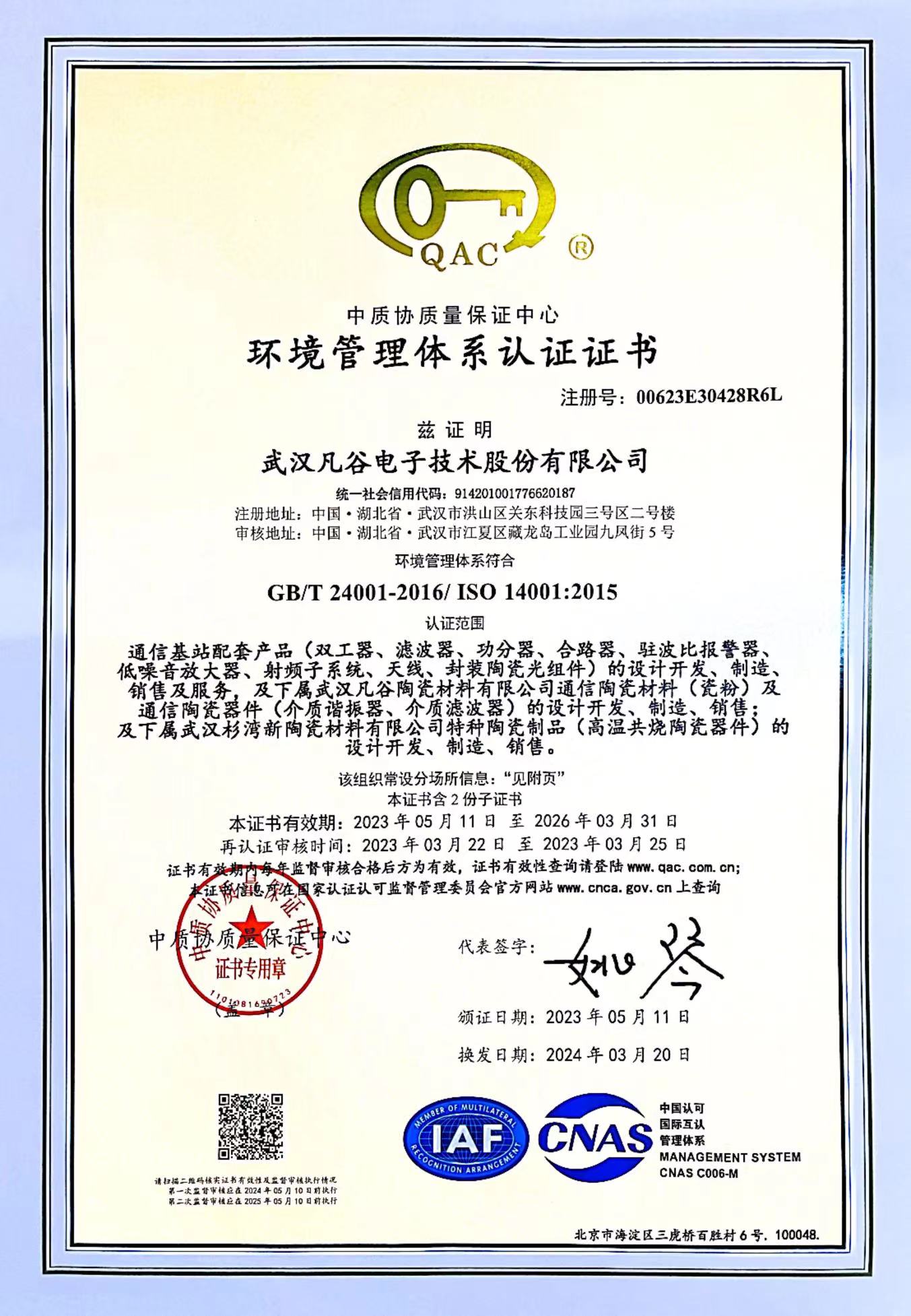 公司自2004年通過ISO14001環境管理體系認證,目前保持有ISO14001:2015管理體系認證證書。